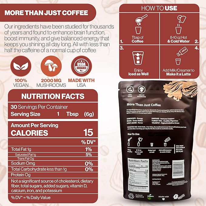 Each serving contains the perfect balance of clean caffeine from high-quality coffee beans and mushroom extracts that support focus, memory, and overall well-being. Sourced from certified organic mushrooms and premium coffee beans, it’s the perfect daily ritual for those who want to improve productivity, mental clarity, and performance naturally. With 30 servings in each bag, you can enjoy a delicious cup of mushroom coffee every day, guilt-free.